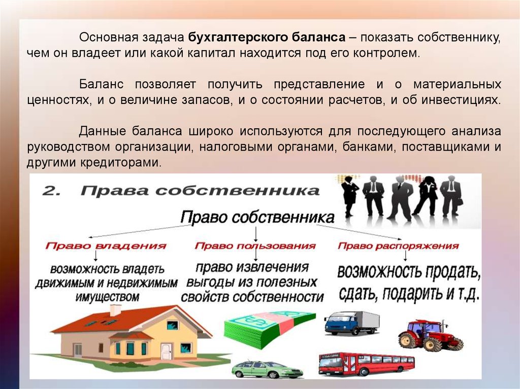 Основная задача бухгалтерского баланса – показать собственнику,чем он владеет или какой капитал находится под его контролем.