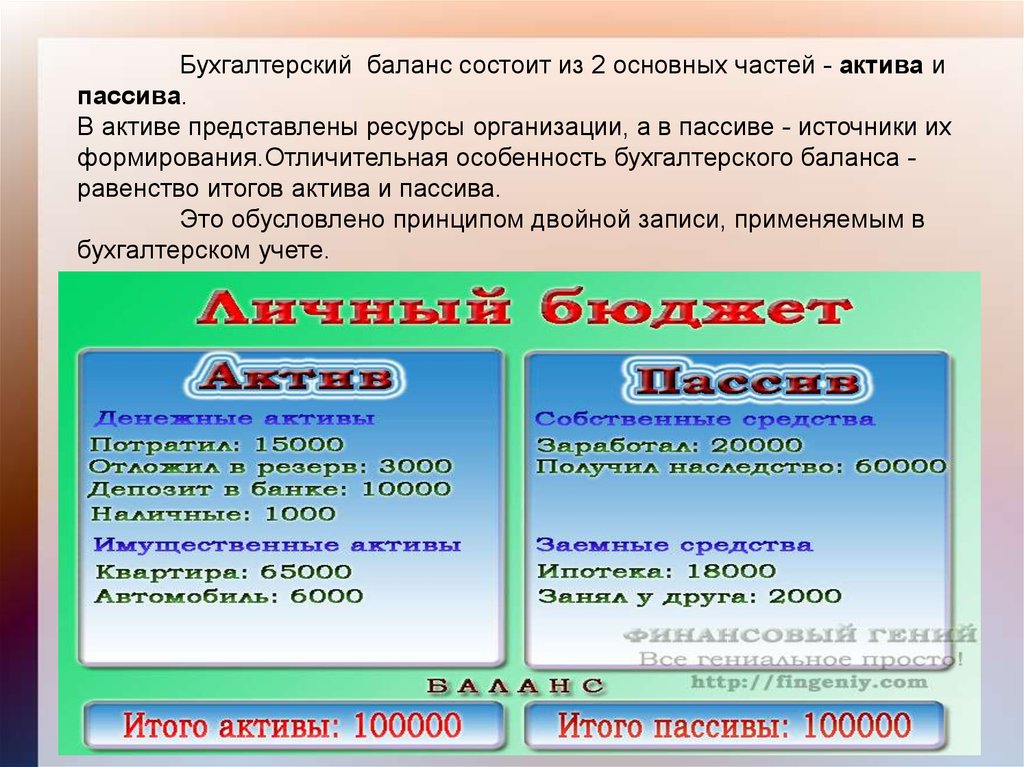 Бухгалтерский баланс состоит из 2 основных частей - актива ипассива.