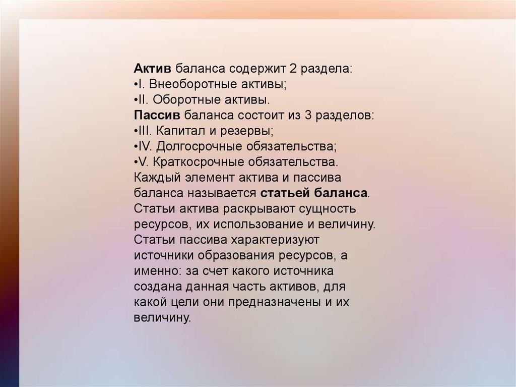 Актив баланса содержит 2 раздела:•I. Внеоборотные активы;