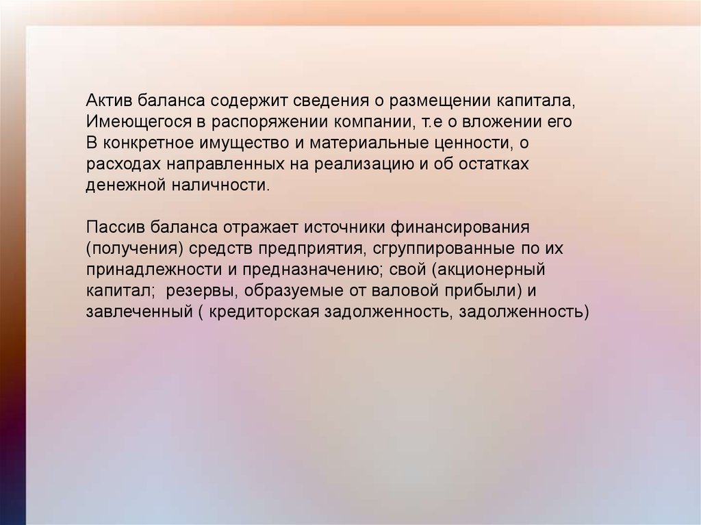 Актив баланса содержит сведения о размещении капитала,Имеющегося в распоряжении компании, т.е о вложении его