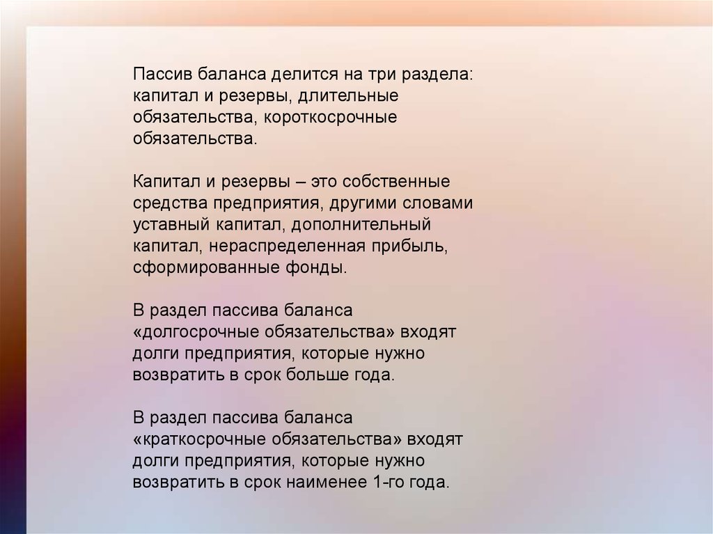 Пассив баланса делится на три раздела:капитал и резервы, длительные