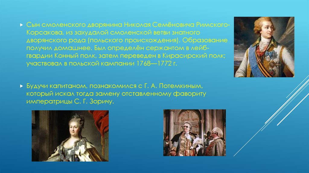 Будучи капитаном, познакомился с Г. А. Потемкиным,