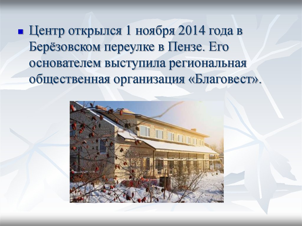 Центр открылся 1 ноября 2014 года вБерёзовском переулке в Пензе. Его
