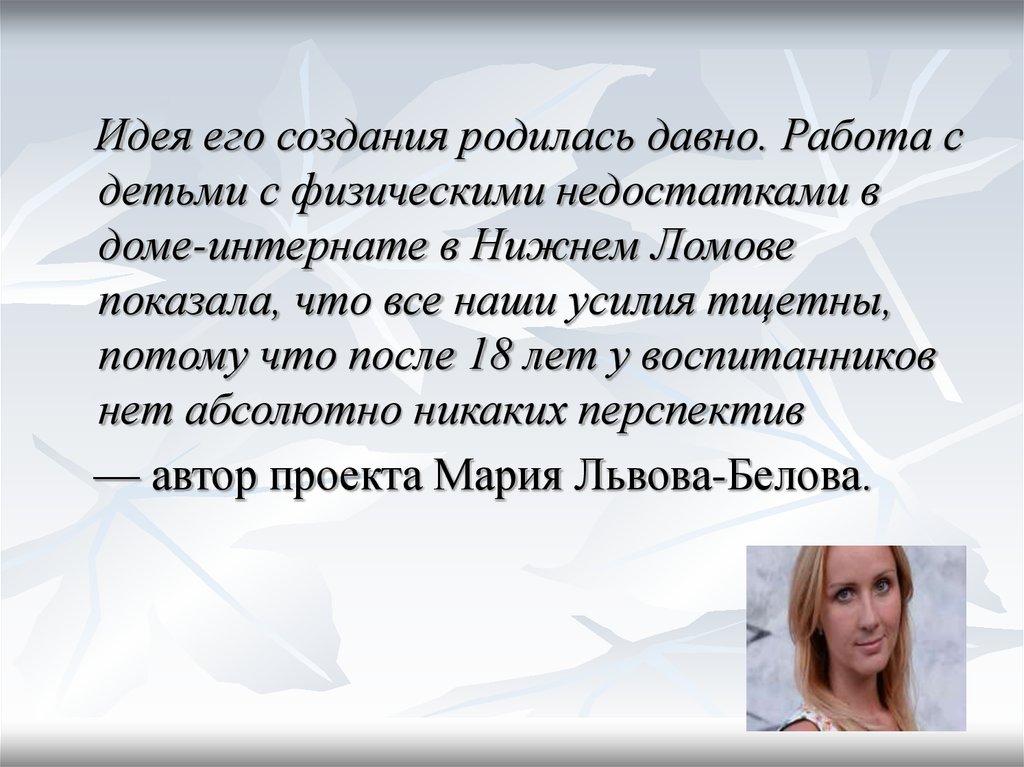 Идея его создания родилась давно. Работа сдетьми с физическими недостатками в
