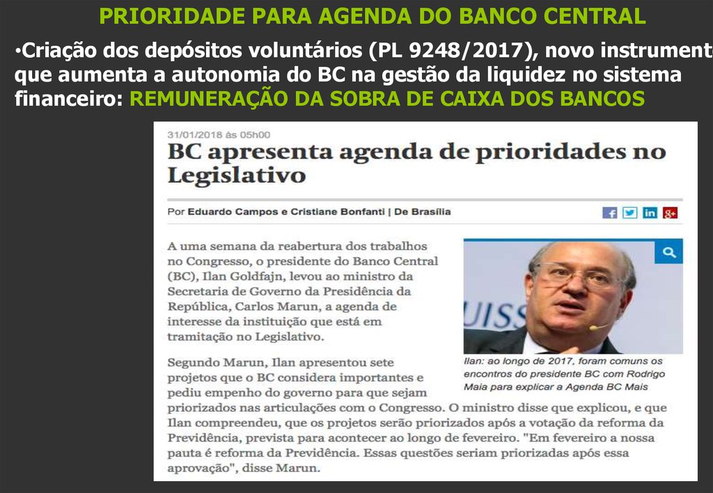 PRIORIDADE PARA AGENDA DO BANCO CENTRAL•Criação dos depósitos voluntários (PL 9248/2017), novo instrumento