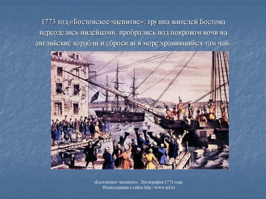 1773 год «Бостонское чаепитие»: группа жителей Бостонапереоделись индейцами, пробрались под покровом ночи на