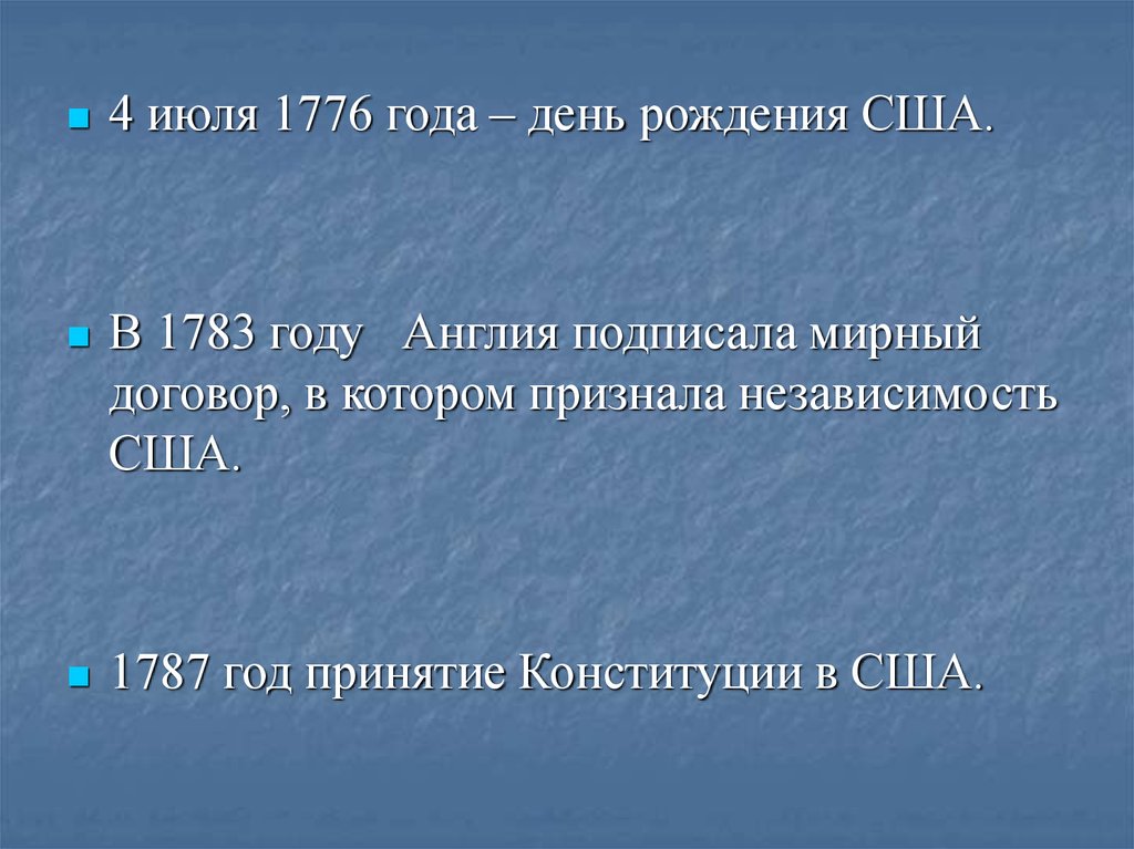 4 июля 1776 года – день рождения США.В 1783 году Англия подписала мирный