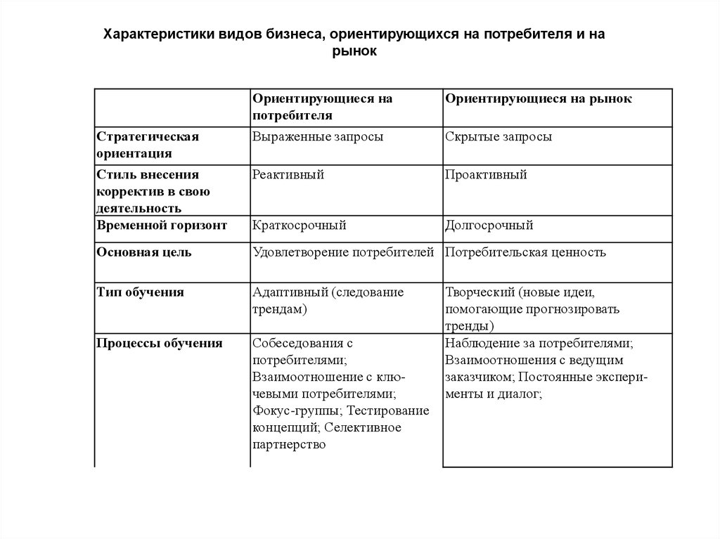 Характеристики видов бизнеса, ориентирующихся на потребителя и нарынок