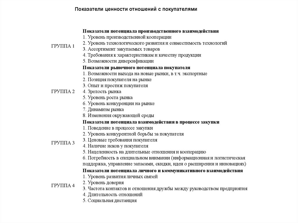Показатели ценности отношений с покупателямиГРУППА 1