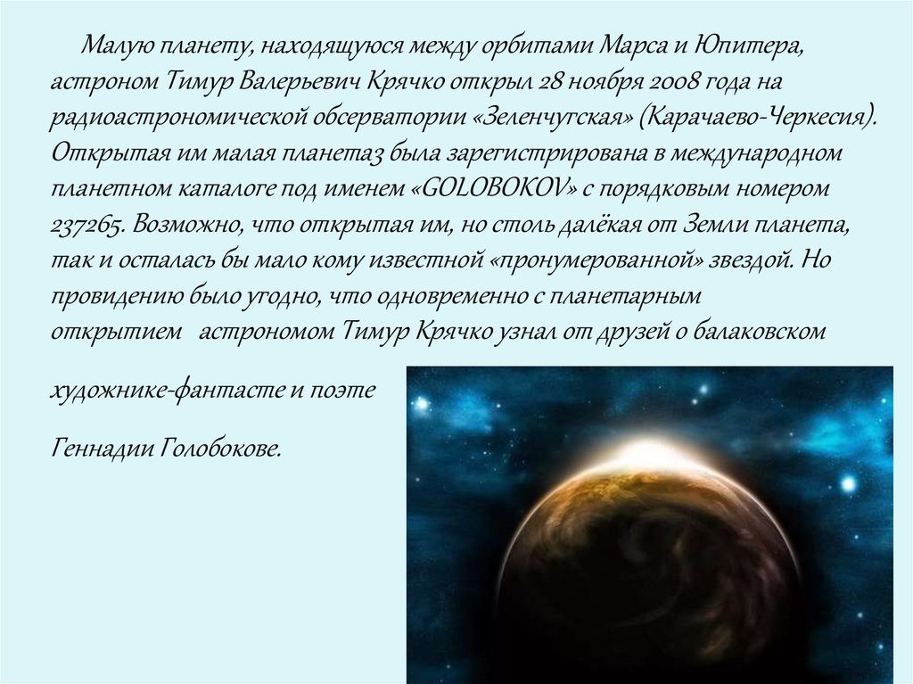 В небольшом волжском городке Балаково ходил в школувлюбленный в звезды мальчишка. Товарищам Гена Голобоков