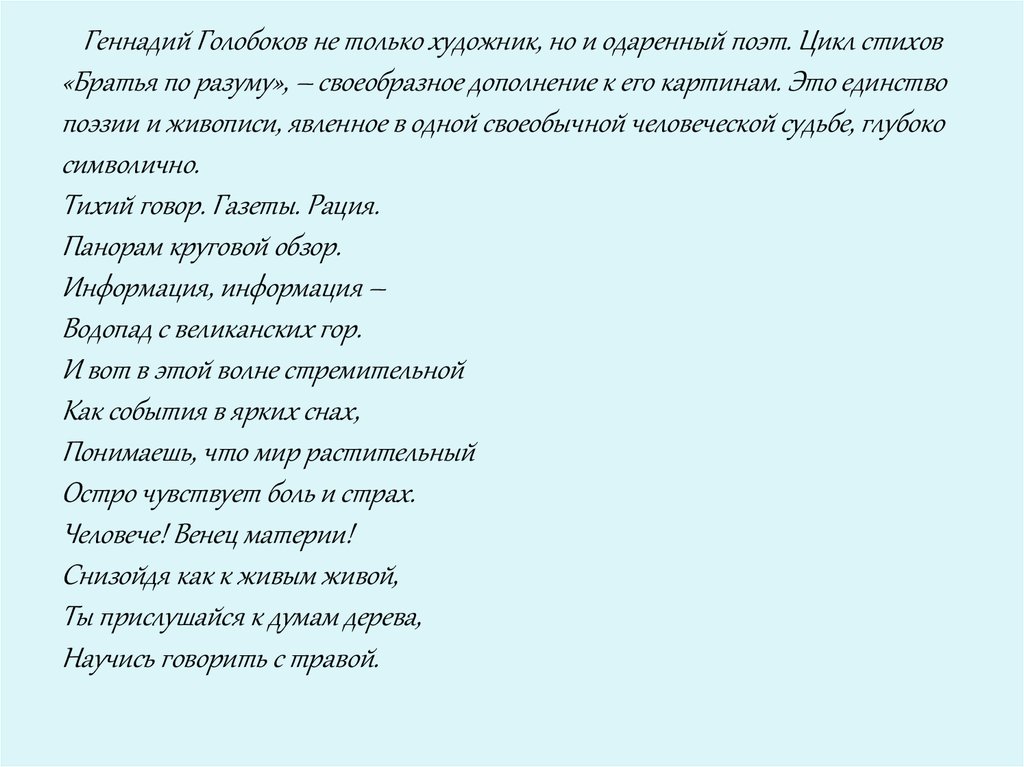 Геннадий Голобоков не только художник, но и одаренный поэт. Цикл стихов«Братья по разуму», – своеобразное дополнение к его картинам. Это единство