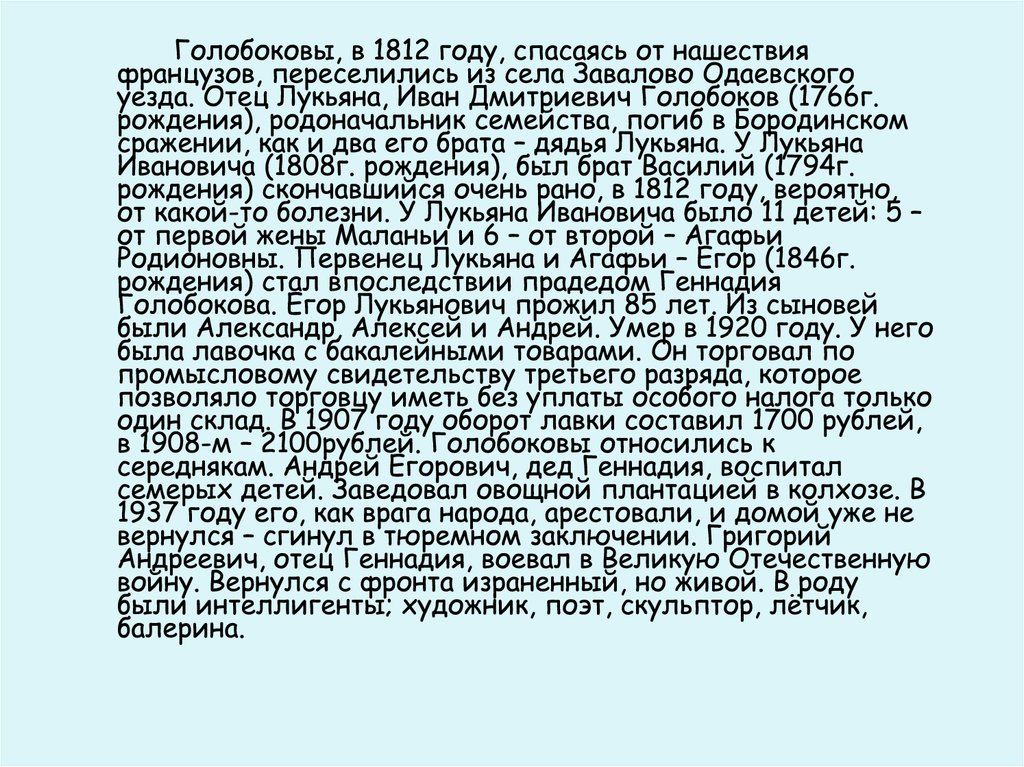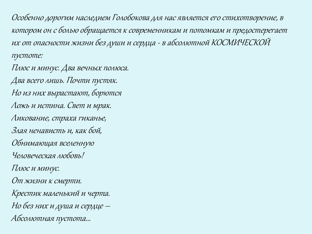 Особенно дорогим наследием Голобокова для нас является его стихотворение, вкотором он с болью обращается к современникам и потомкам и предостерегает
