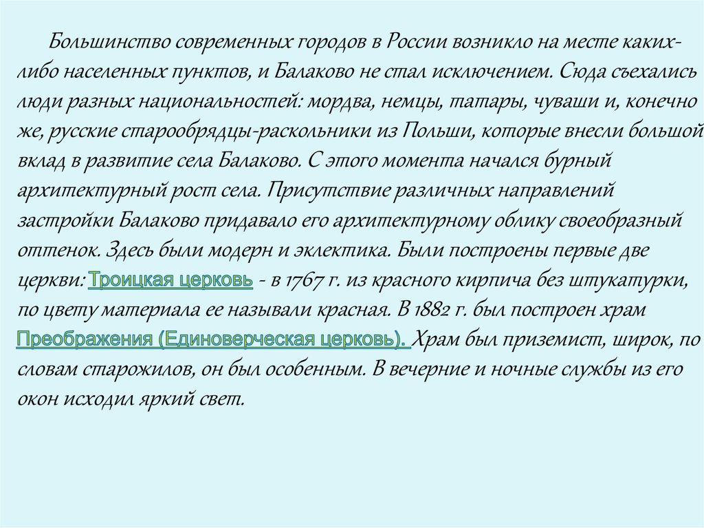 Большинство современных городов в России возникло на месте какихлибо населенных пунктов, и Балаково не стал исключением. Сюда съехалисьлюди разных национальностей: мордва, немцы, татары, чуваши и, конечно