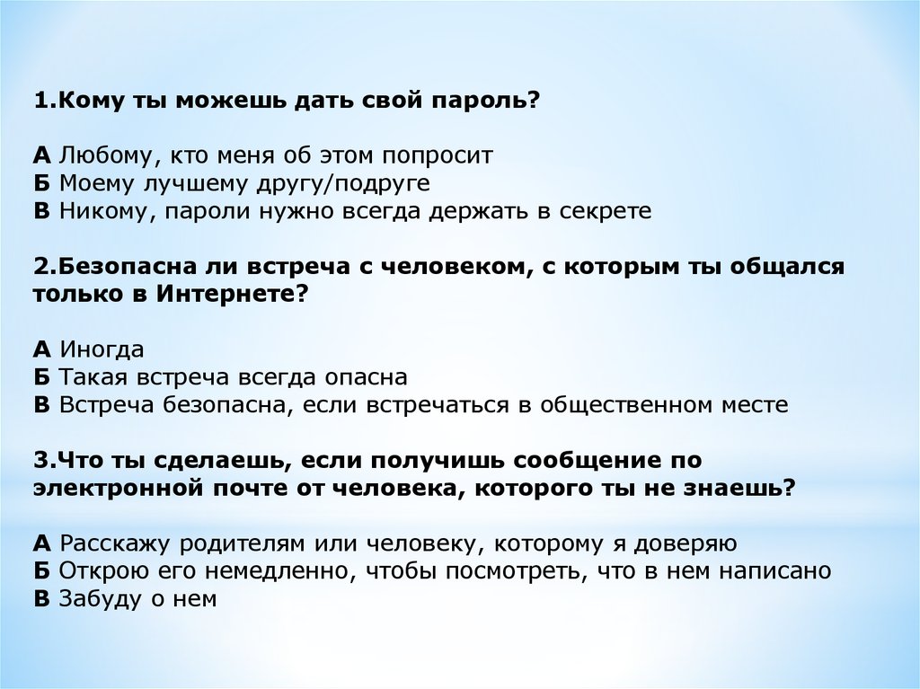 1.Кому ты можешь дать свой пароль?А Любому, кто меня об этом попросит
