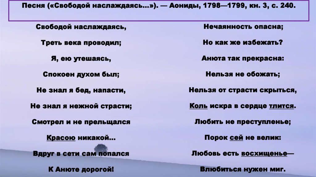 Песня («Свободой наслаждаясь...»). — Аониды, 1798—1799, кн. 3, с. 240.Свободой наслаждаясь,