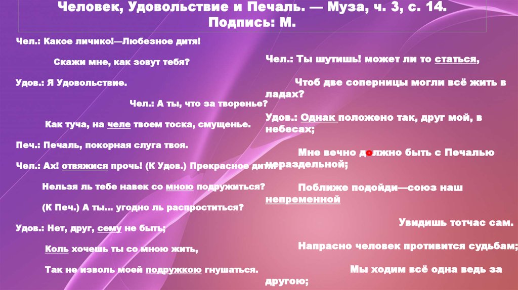 Человек, Удовольствие и Печаль. — Муза, ч. 3, с. 14.Подпись: М.