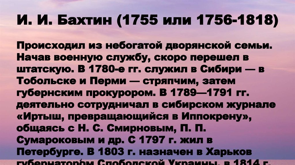 И. И. Бахтин (1755 или 1756-1818)Происходил из небогатой дворянской семьи.