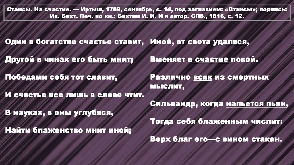 Стансы. На счастие. — Иртыш, 1789, сентябрь, с. 14, под заглавием: «Стансы»; подпись:Ив. Бахт. Печ. по кн.: Бахтин И. И. И я автор. СПб., 1816, с. 12.