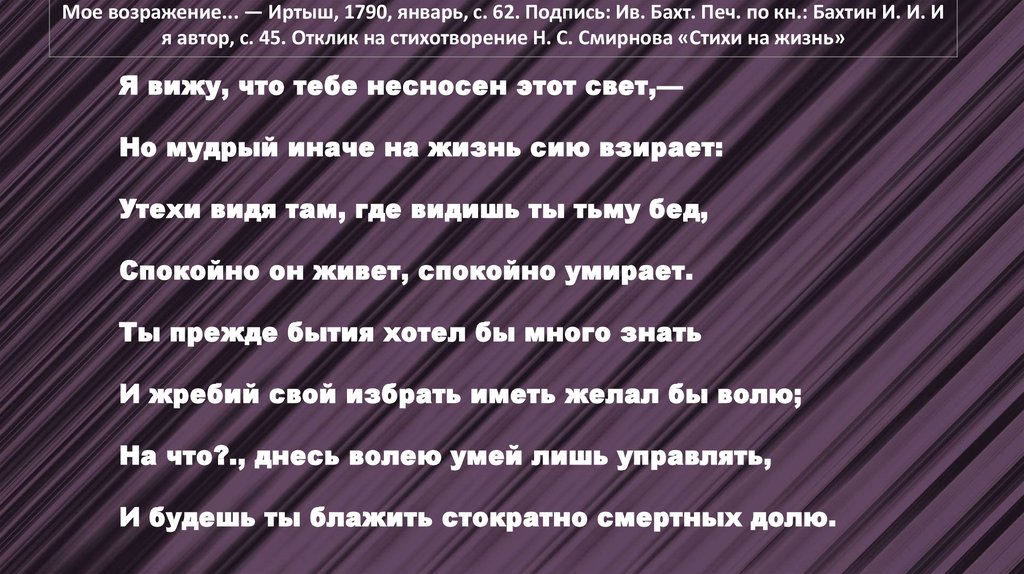 Мое возражение... — Иртыш, 1790, январь, с. 62. Подпись: Ив. Бахт. Печ. по кн.: Бахтин И. И. Ия автор, с. 45. Отклик на стихотворение Н. С. Смирнова «Стихи на жизнь»