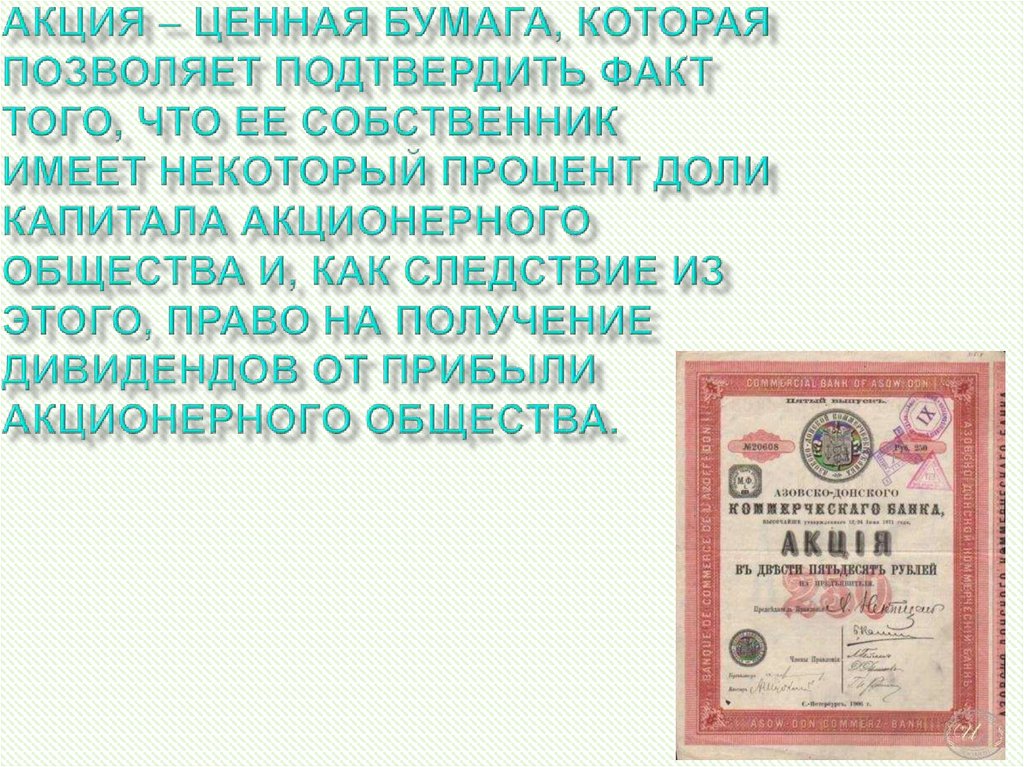1. Акция – ценная бумага, которая позволяет подтвердить факт того, что ее собственник имеет некоторый процент доли капитала