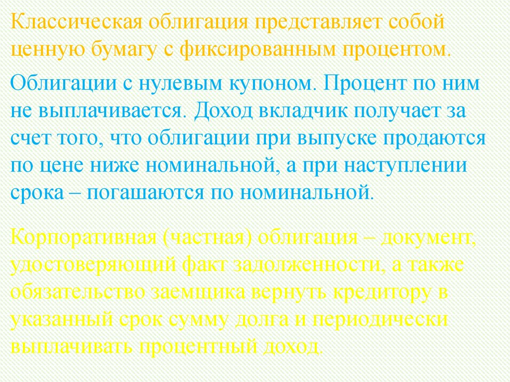 Классическая облигация представляет собойценную бумагу с фиксированным процентом.