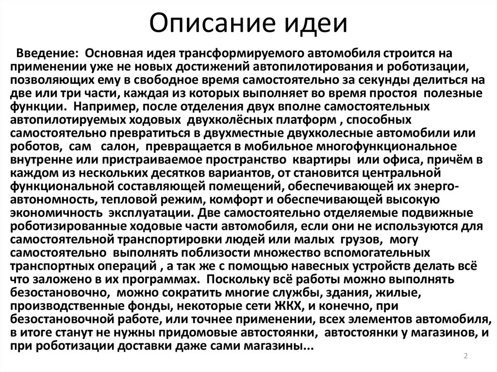 Введение: Основная идея трансформируемого автомобиля строится наприменении уже не новых достижений автопилотирования и роботизации,