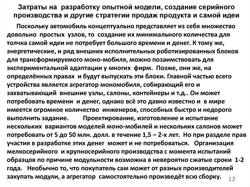 12. Затраты на разработку опытной модели, создание серийного производства и другие стратегии продаж продукта и самой идеи