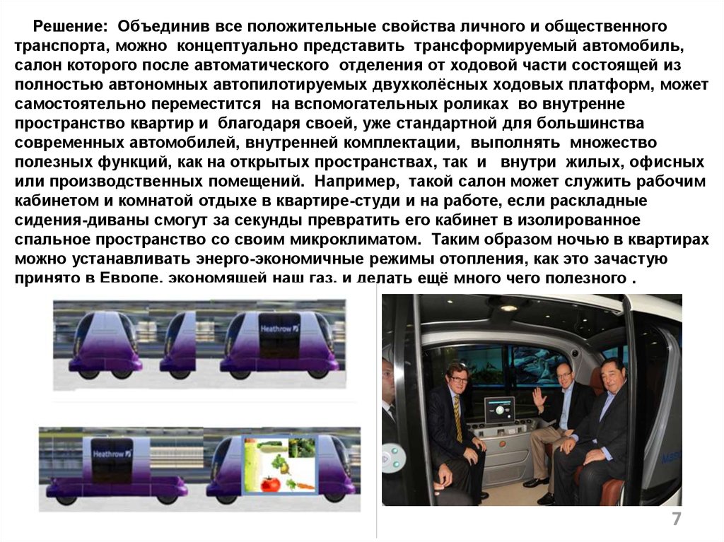 7. Решение: Объединив все положительные свойства личного и общественного транспорта, можно концептуально представить