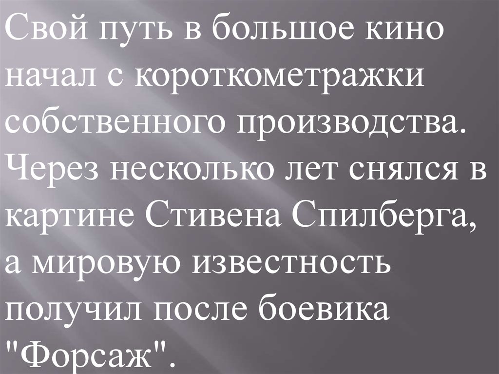 His way to the big cinema began with a short film of hisown production. A few years later he appeared in Steven