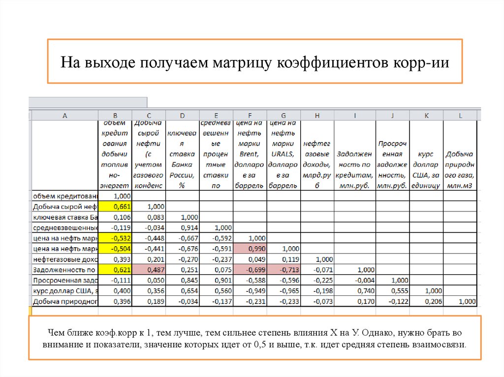 На выходе получаем матрицу коэффициентов корр-ииЧем ближе коэф.корр к 1, тем лучше, тем сильнее степень влияния Х на У. Однако, нужно брать во