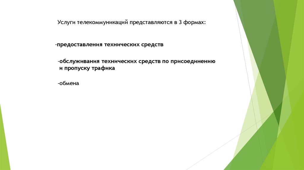 Услуги телекоммуникаций представляются в 3 формах:-предоставления технических средств