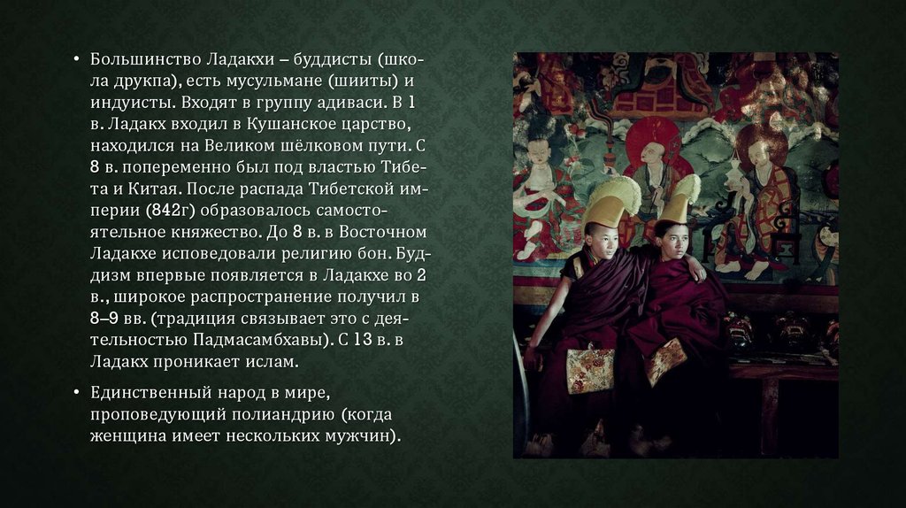 • Большинство Ладакхи – буддисты (школа друкпа), есть мусульмане (шииты) ииндуисты. Входят в группу адиваси. В 1