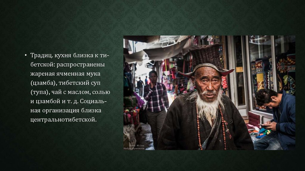 • Традиц. кухня близка к тибетской: распространеныжареная ячменная мука
