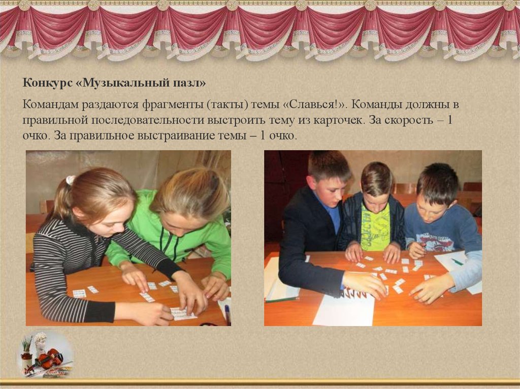Конкурс «Музыкальный пазл»Командам раздаются фрагменты (такты) темы «Славься!». Команды должны в