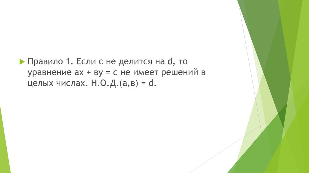 Правило 1. Если с не делится на d, тоуравнение ах + ву = с не имеет решений в