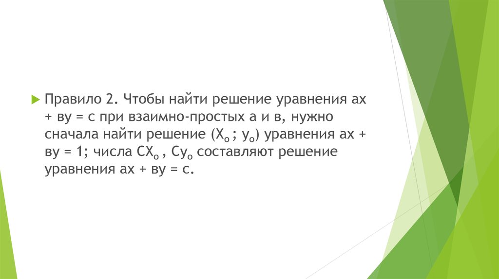 Правило 2. Чтобы найти решение уравнения ах+ ву = с при взаимно-простых а и в, нужно
