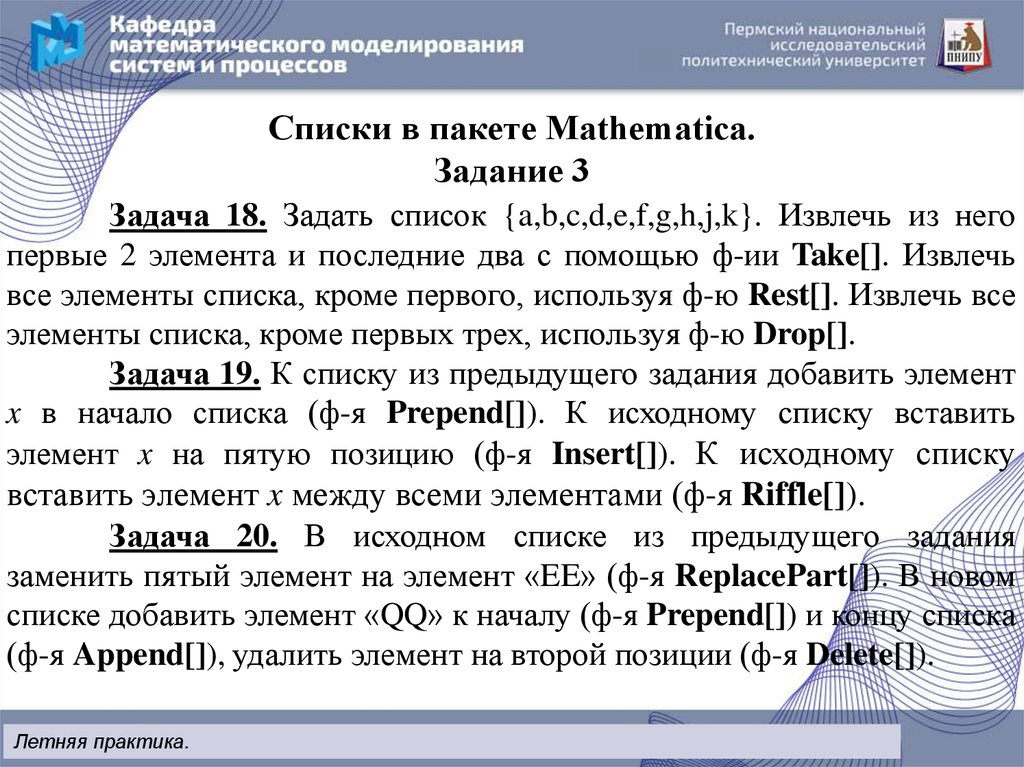 (ф-я Append[]), удалить элемент на второй позиции (ф-я Delete[]).