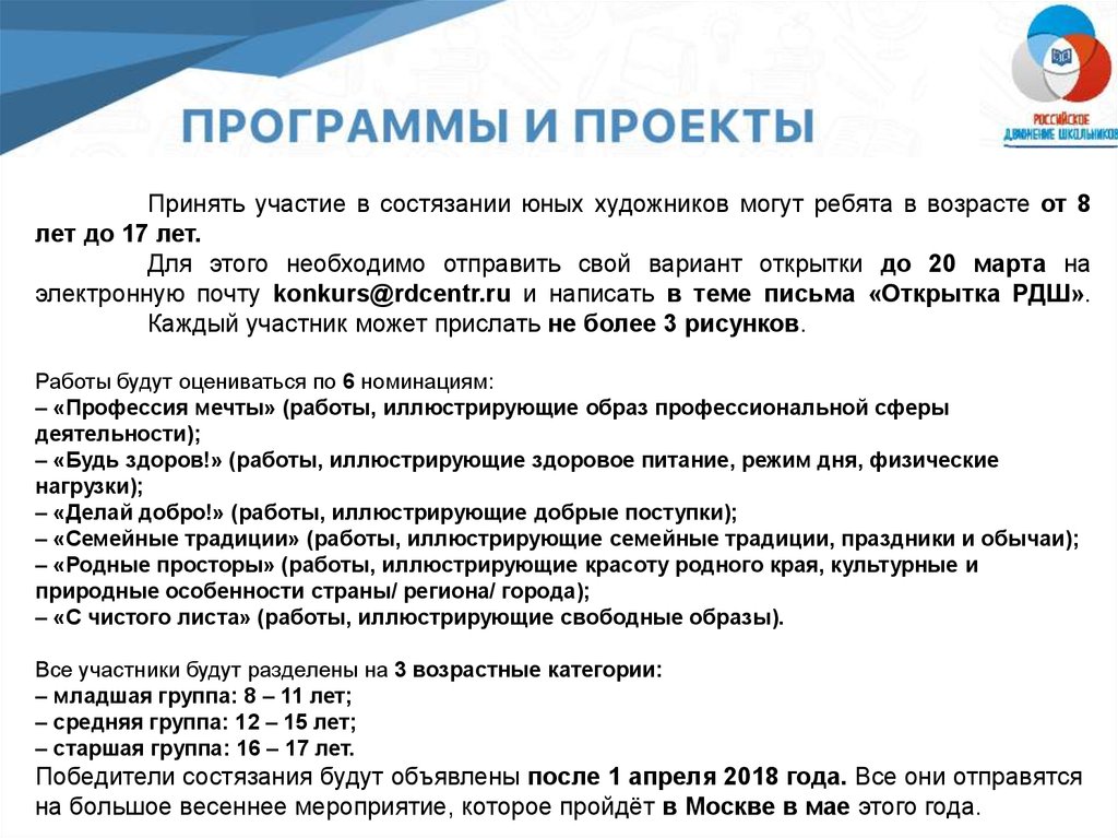 электронную почту konkurs@rdcentr.ru и написать в теме письма «Открытка РДШ».