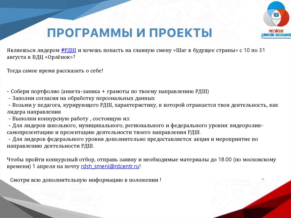 времени) 1 апреля на почту rdsh_smeni@rdcentr.ru!