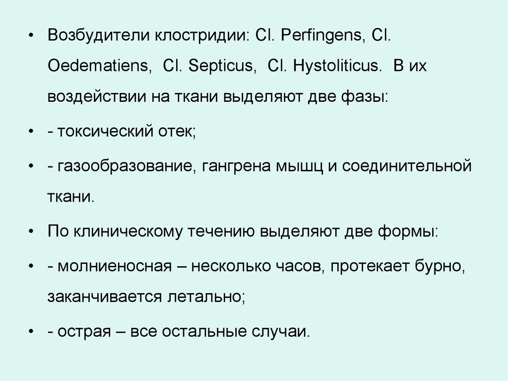 • Возбудители клостридии: Cl. Perfingens, Cl.Oedematiens, Cl. Septicus, Cl. Hystoliticus. В их