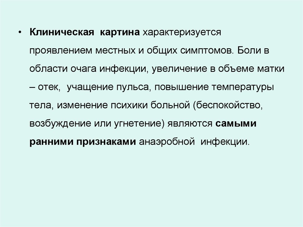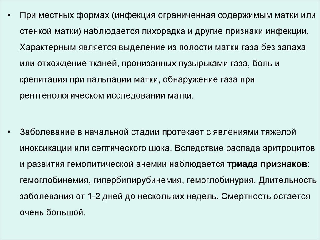 • При местных формах (инфекция ограниченная содержимым матки илистенкой матки) наблюдается лихорадка и другие признаки инфекции.