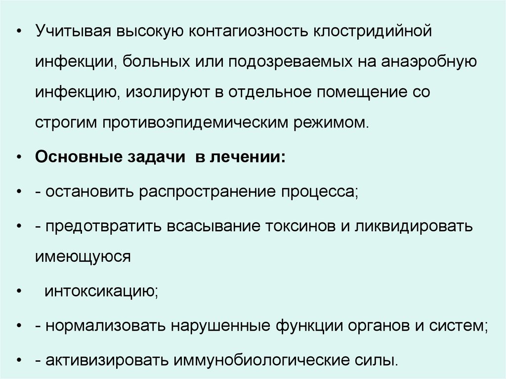 • Учитывая высокую контагиозность клостридийнойинфекции, больных или подозреваемых на анаэробную