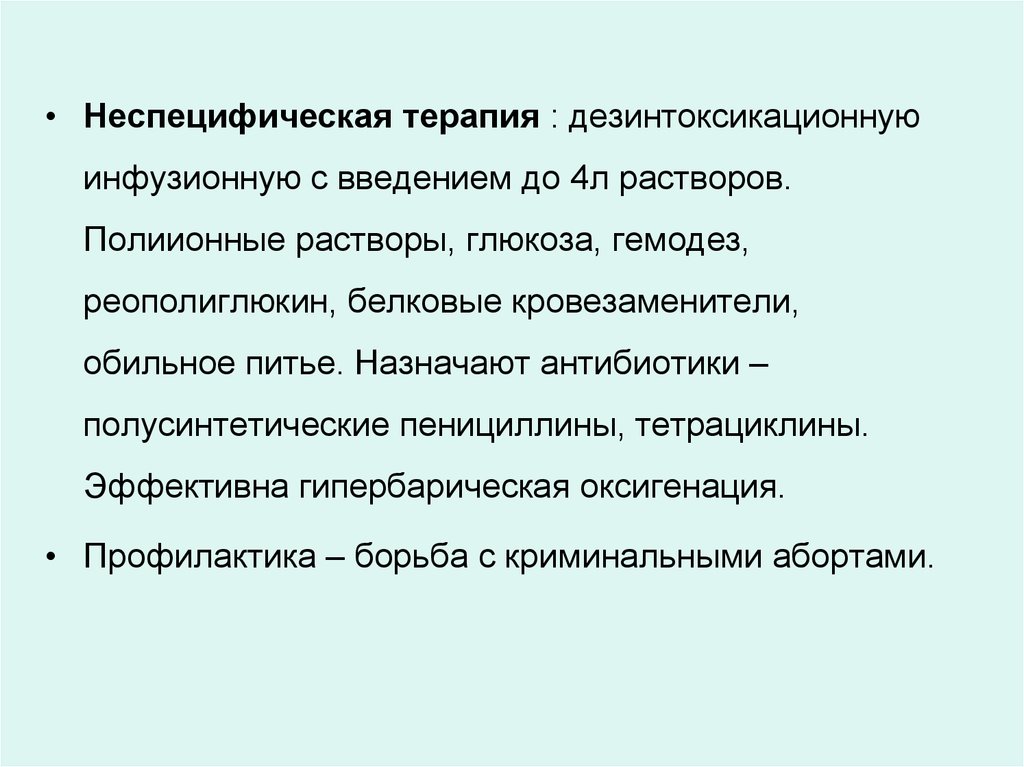 • Неспецифическая терапия : дезинтоксикационнуюинфузионную с введением до 4л растворов.