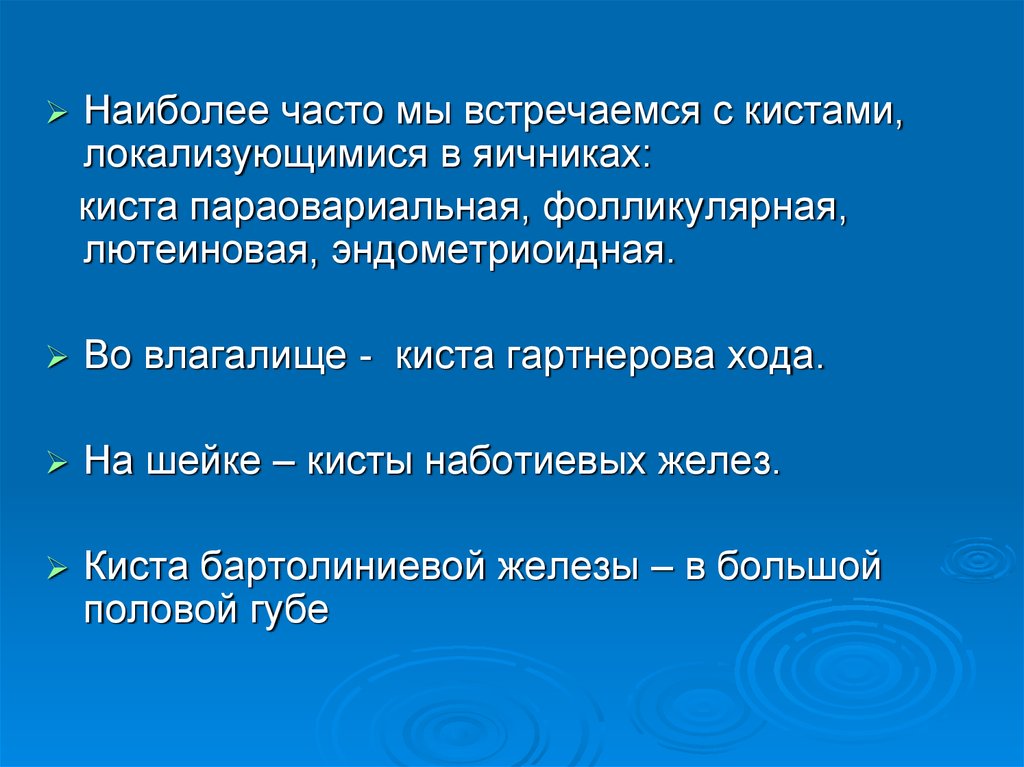 Наиболее часто мы встречаемся с кистами,локализующимися в яичниках: