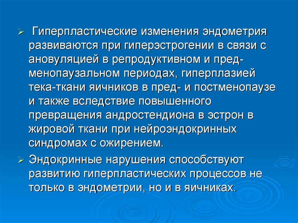 Гиперпластические изменения эндометрияразвиваются при гиперэстрогении в связи с