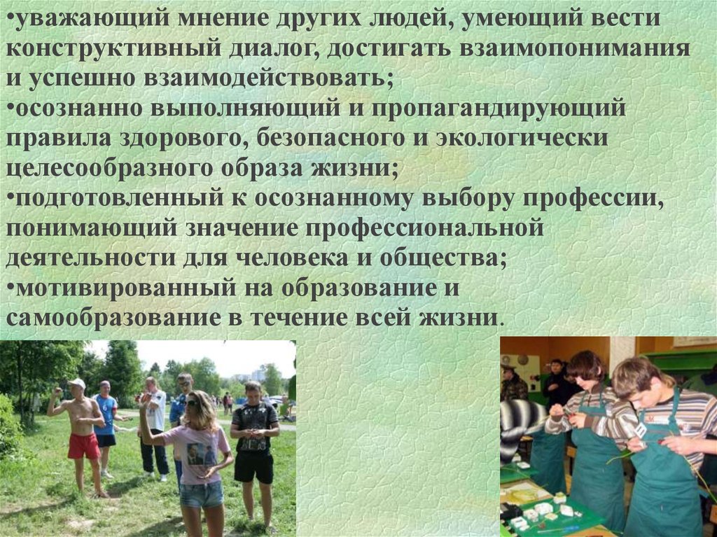 •уважающий мнение других людей, умеющий вестиконструктивный диалог, достигать взаимопонимания
