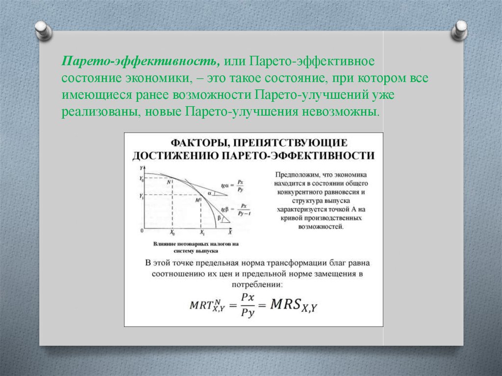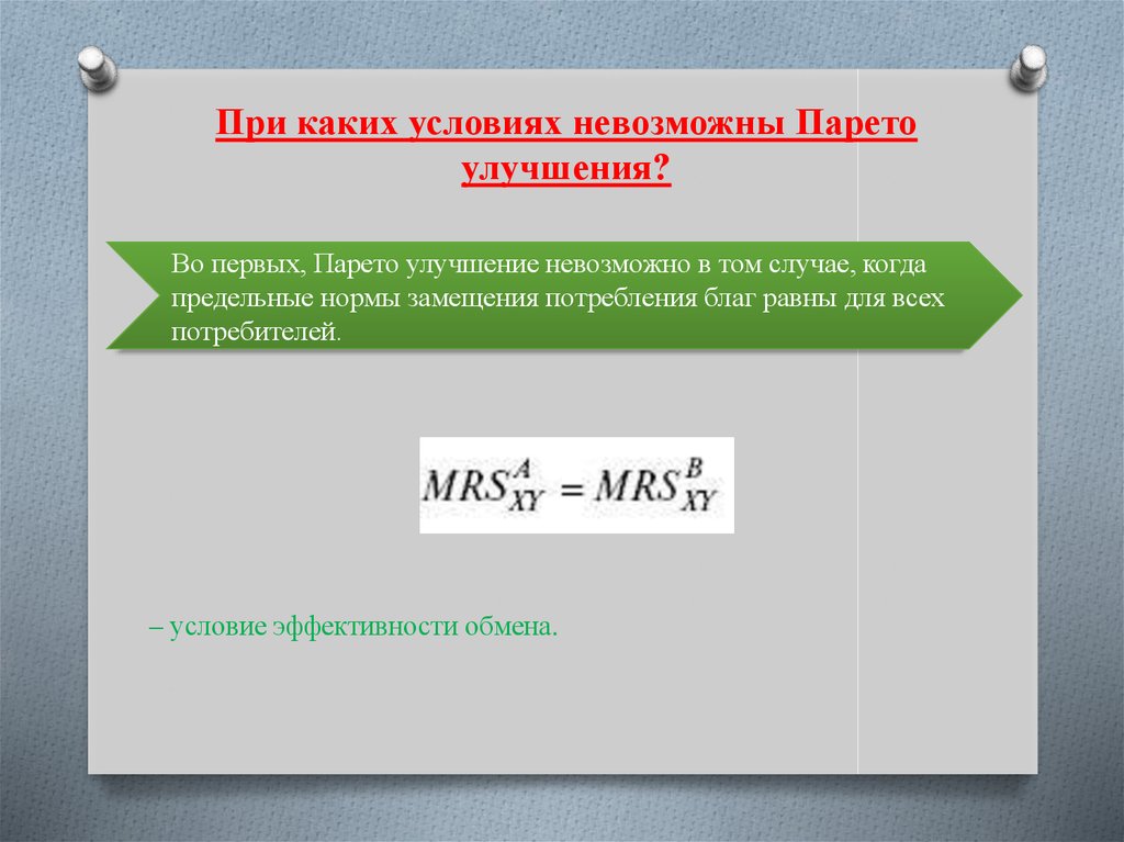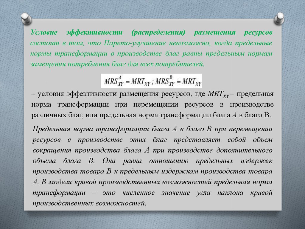 Условие эффективности (распределения) размещения ресурсовсостоит в том, что Парето-улучшение невозможно, когда предельные