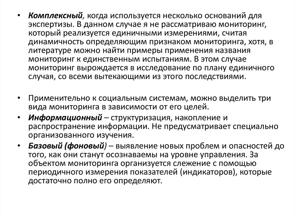 • Комплексный, когда используется несколько оснований дляэкспертизы. В данном случае я не рассматриваю мониторинг,