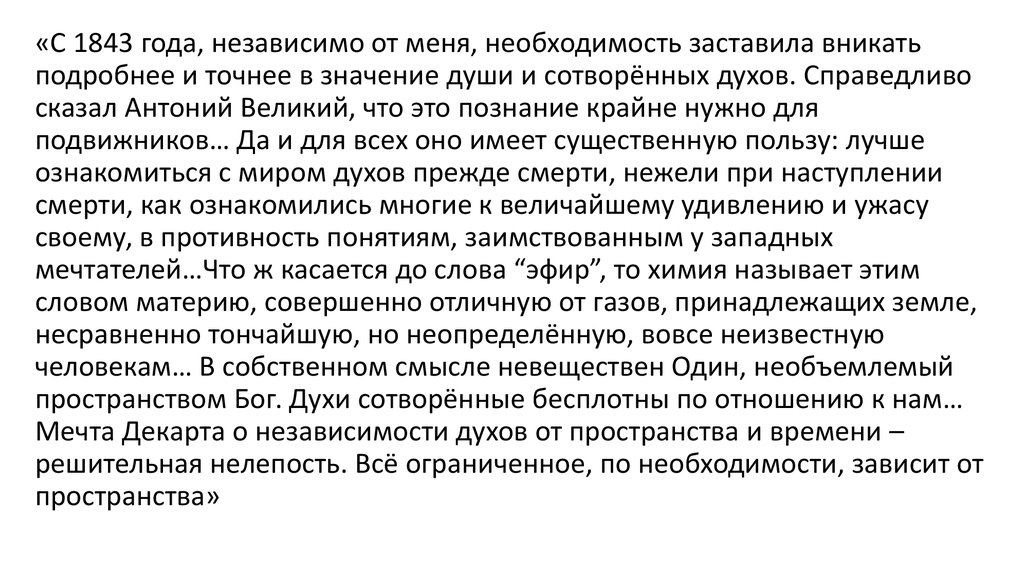 «С 1843 года, независимо от меня, необходимость заставила вникатьподробнее и точнее в значение души и сотворённых духов. Справедливо