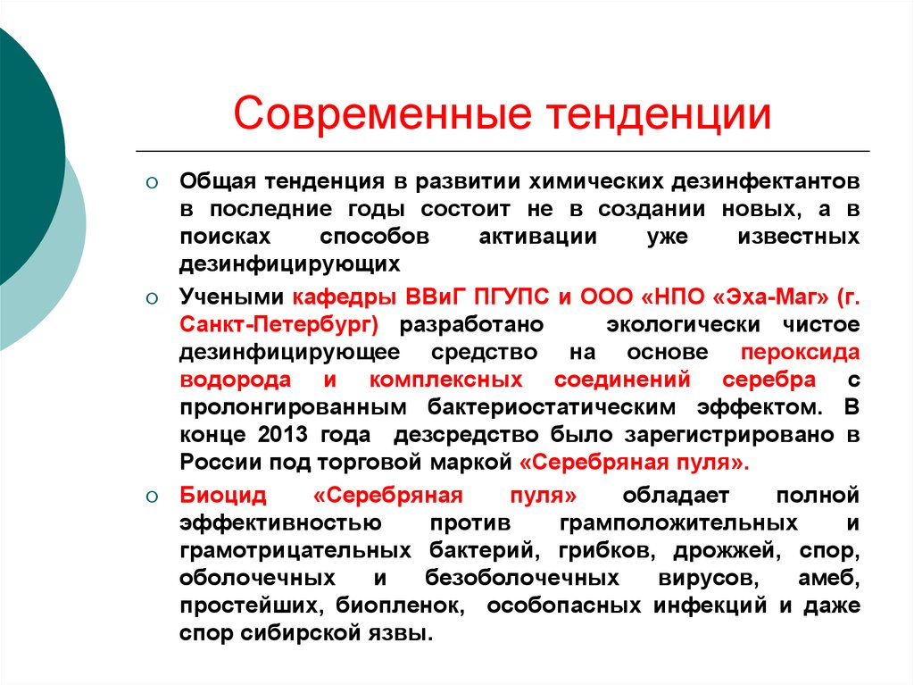 Общая тенденция в развитии химических дезинфектантовв последние годы состоит не в создании новых, а в